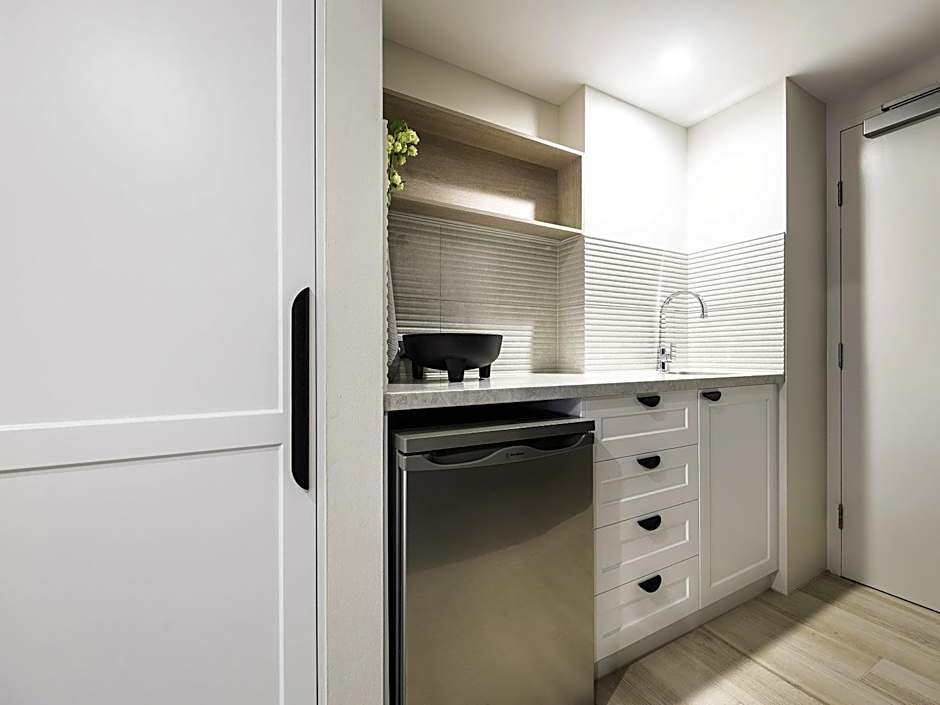 The apartment's kitchen, which has a refrigerator and a microwave, is available for cooking and storing food. The apartment features air conditioning, a tea and coffee maker, a safe deposit box as well as a balcony with city views.